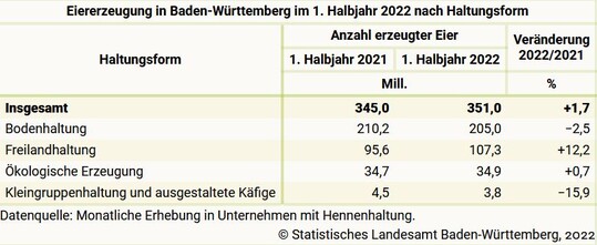 Deutliche Zugewinne konnten nur in der Freilandhaltung verzeichnet werden. Innerhalb eines Jahres wurde die Kapazität um 100.000 Freiland-Haltungsplätze ausgebaut. Die Produktion stieg im Vergleich zum ersten Halbjahr 2021 um 12 % auf nun 107 Mio. Eier. Von zehn erzeugten Eiern in Baden-Württemberg kommen drei aus dieser Haltungsform.