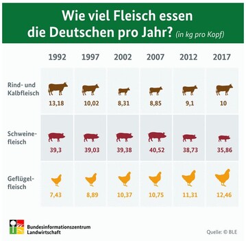 Knapp 60 Kilo Fleisch essen die Deutschen pro Jahr. Die Menge blieb zwischen 1992 und 2017 nahezu konstant, aber der Appetit auf Schwein und Rind sank, während Geflügel gewinnt.