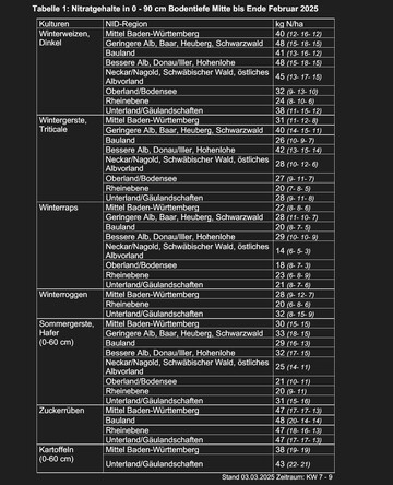 Die aktuellen Nitratwerte in den Ackerböden zeigen einen leichten Anstieg im Vergleich zur Vorwoche. Besonders bei Winterungen und geplanten Sommerungen sind höhere Gehalte messbar. Regionale Unterschiede bleiben weiterhin bestehen.