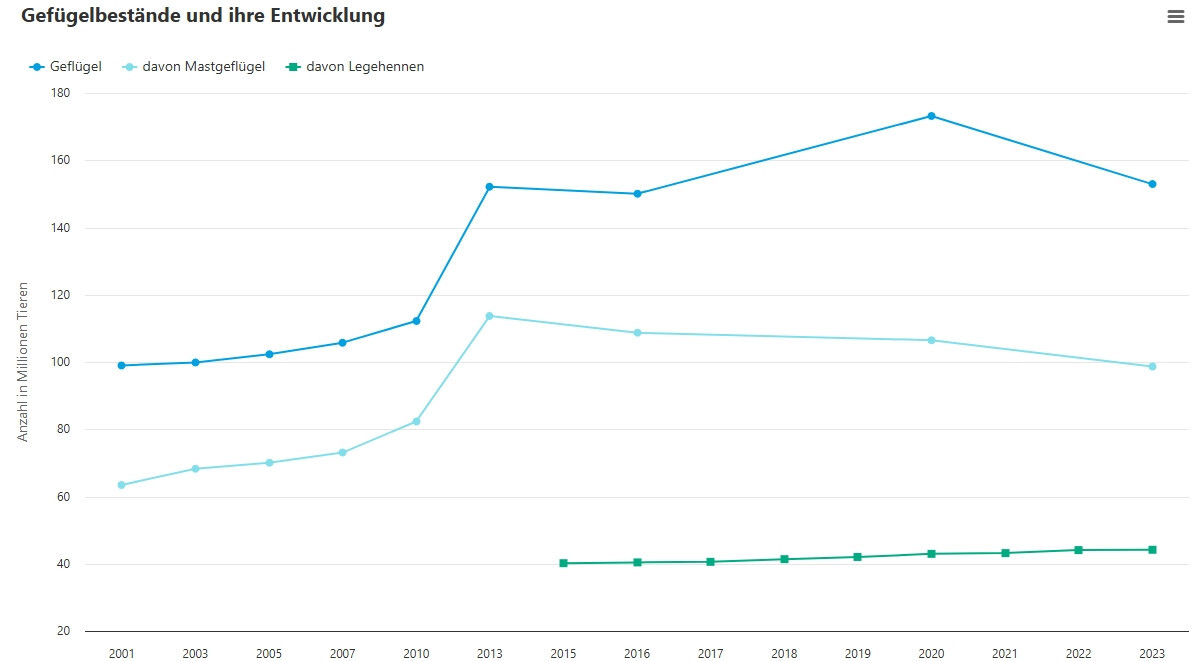 Geflügel hat zahlenmäßig den höchsten Anteil an Tieren, was jedoch nicht verwundert. 2020 wurden in Deutschland noch insgesamt 170 Millionen Tiere gehalten; darunter waren knapp 107 Millionen Mastgeflügel inklusive Truthühner, Enten und Gänse. Der Bestand der Legehennen ist gestiegen und betrug in 2023 gut 44 Millionen Tiere.