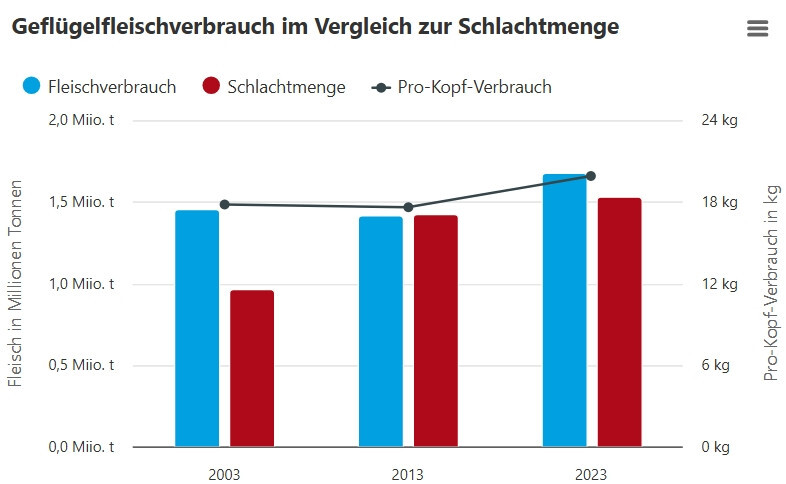 Anders als für Schweine- und Rindfleisch ist beim Geflügelfleisch eine positive Entwicklung von Produktion und Verbrauch zu beobachten. Die Schlachtmenge bei Geflügel ist von 1,3 Mio. t im Jahr 2010 auf über 1,5 Mio. t im Jahr 2023 gestiegen und hat damit in ihrer Bedeutung die Rindfleischproduktion überholt. 2023 haben die Deutschen knapp 1,68 Mio. t Geflügelfleisch verbraucht. Das ist nach einem Rückgang im Jahr 2022 wieder ein leichter Anstieg und entspricht einem Pro-Kopf-Verbrauch von 19,9 kg je Person. Produktion und Verbrauch erreichten aber noch nicht wieder die Rekordwerte des Corona-Jahres 2020.