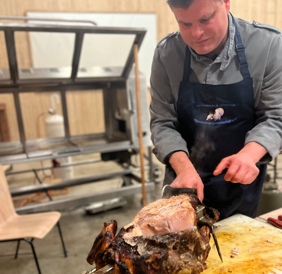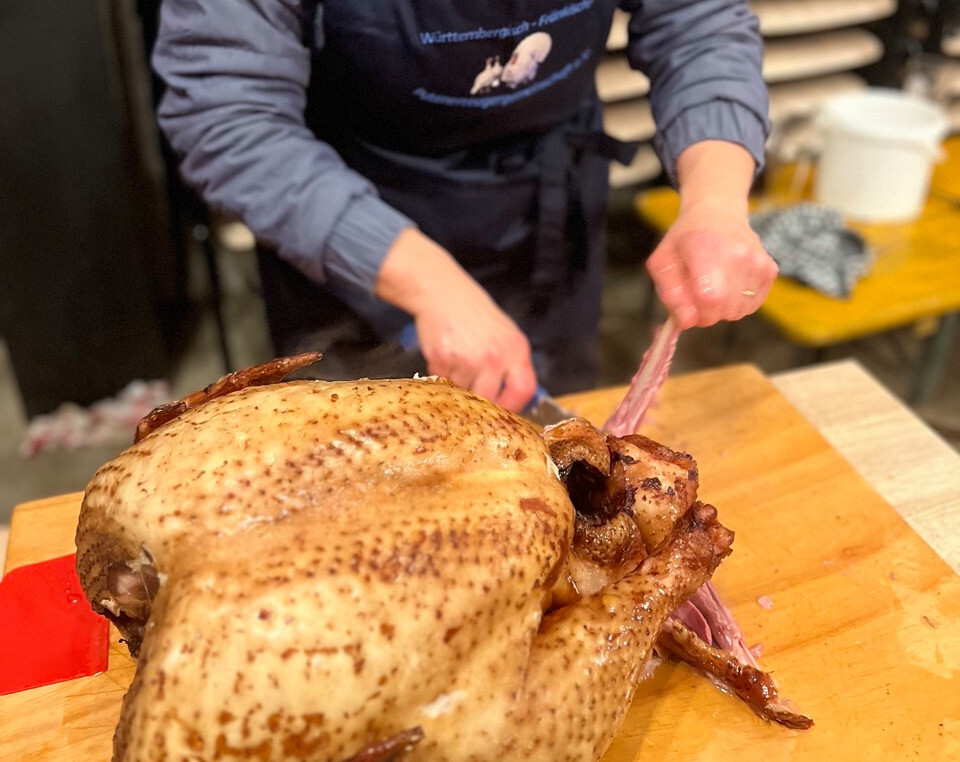 Nicht nur in deutschen Großstädten wird die Tradition beliebter, auch in ländlichen Regionen. Beim nordamerikanischen Erntedankfest spielt ein Lebensmittel die Hauptrolle: „Diese schöne Tradition, das genussvolle Zelebrieren der Pute zu Thanksgiving, genau das wollen wir auch nach Süddeutschland holen“, sagt Könninger. Mittlerweile ist Thanksgiving zu einem wiederkehrenden Fest in Hohenlohe geworden. Was „in familiärem Kreise“ 2023 erstmals geplant war, wie Gudrun Maurer, Mitarbeiterin der PEG, erzählt, wurde im Jahr 2024 zu einer großen, einladenden Tafel für etwa 150 Gäste aus Landwirtschaft, Gesellschaft und Politik.