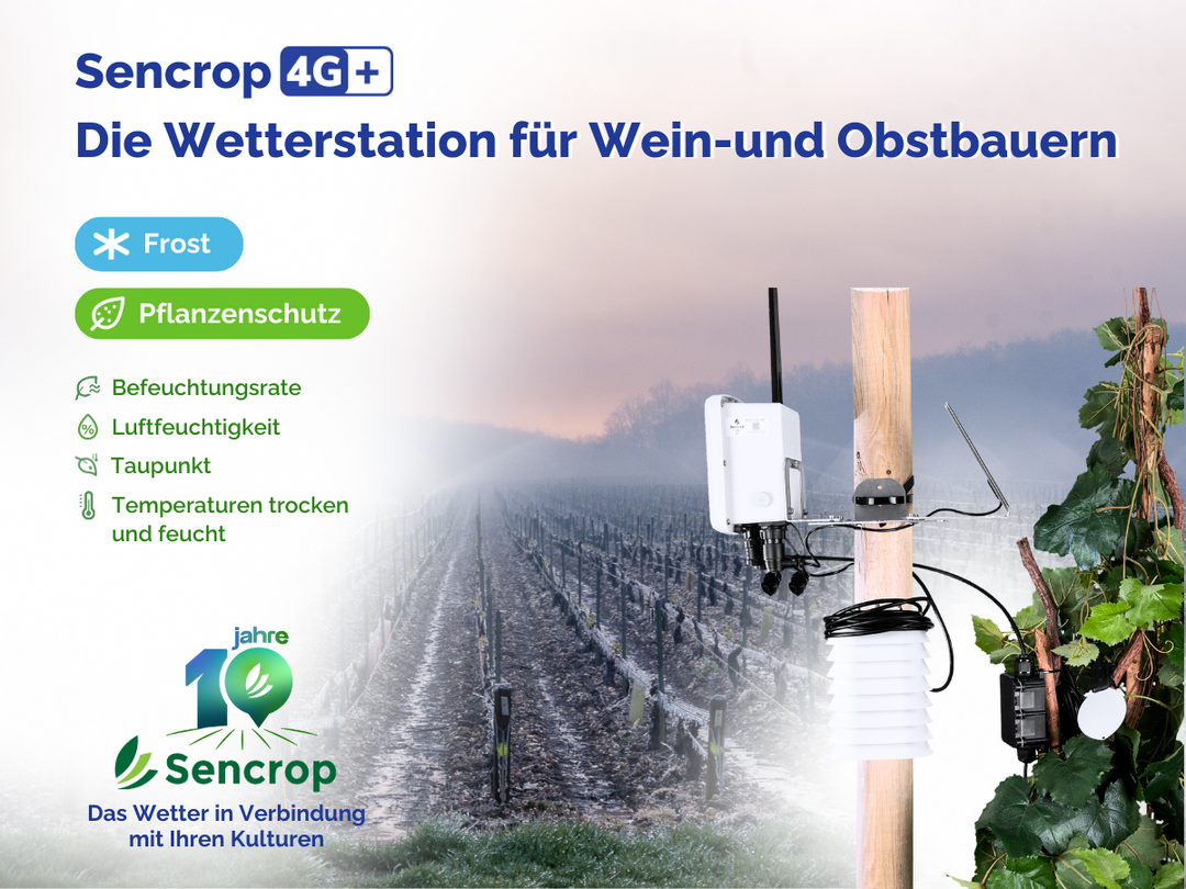 Schützen Sie Ihre Ernte! Die Leafcrop 4G+ Wetterstation misst die Feuchttemperatur und warnt Weinbauern in Kombination mit der Sencrop-App rechtzeitig vor Frostrisiken. Aktivieren Sie den Frostalarm, handeln Sie gezielt und vermeiden Sie Ernteausfälle.