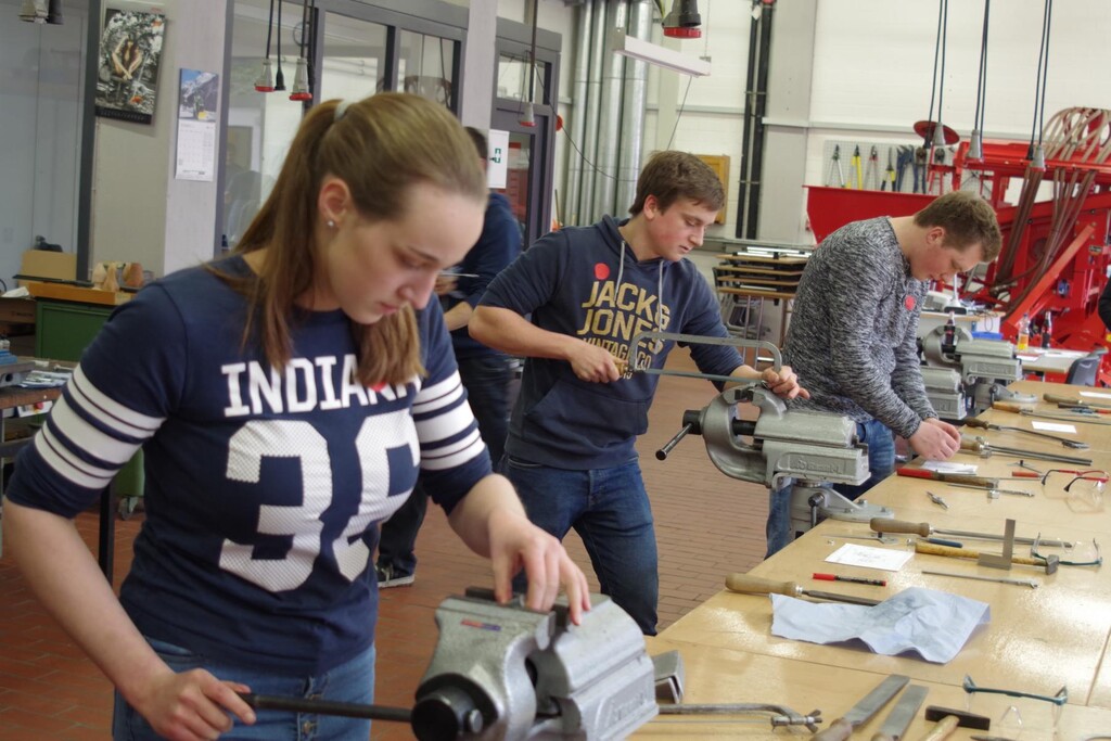 Knarzend bohren die Prüflinge Gewinde in eine Sechskantmutter, anschließend sägen sie eine Kante im Winkel von 105 Grad heraus. Junge Landwirte aus dem Landkreis Schwäbisch-Hall und mehrere Prüfer pendeln zwischen Werkbank und Bohrmaschinen, sehen ab und zu auf die Uhr.