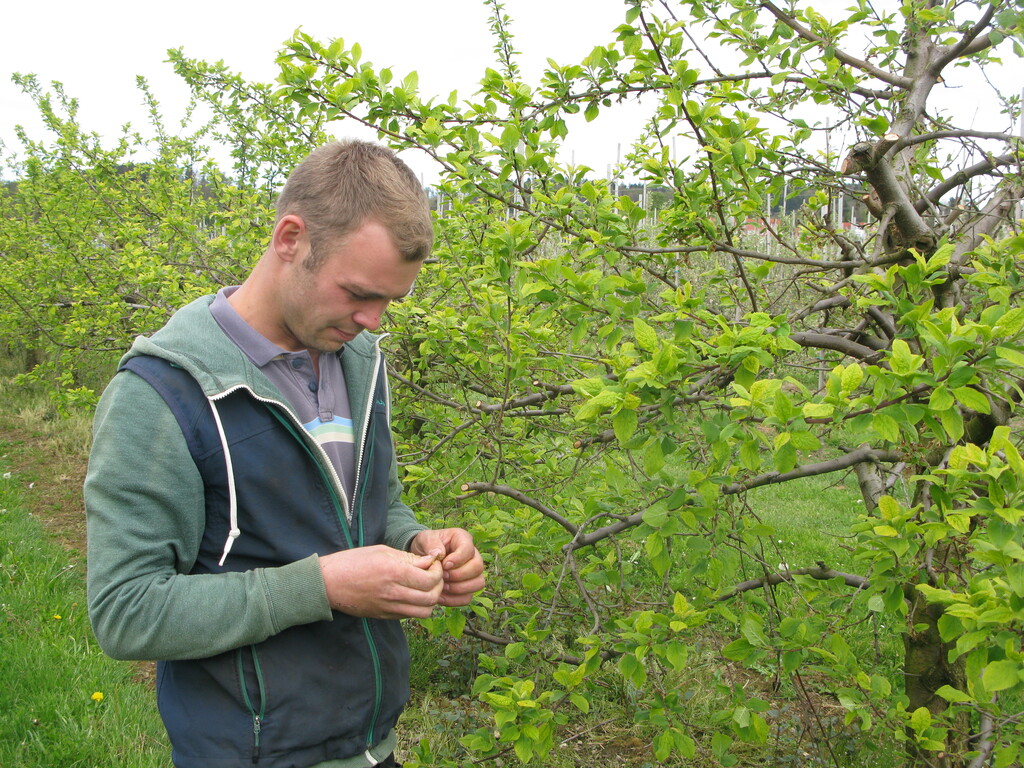 Gerade die jungen Bestände leiden unter solchen Wetterextremen. Sie brauchen in den ersten Jahren Fruchtbehang, sonst richten sich ihre Äste nicht zur Seite, sondern nach oben aus. Hat ein Baum keine Äpfel, „fängt er das spinnen an“, formuliert es Alexander Rist. Der Baum hat dann ein erhöhtes Wachstum und bildet sehr lange Triebe.