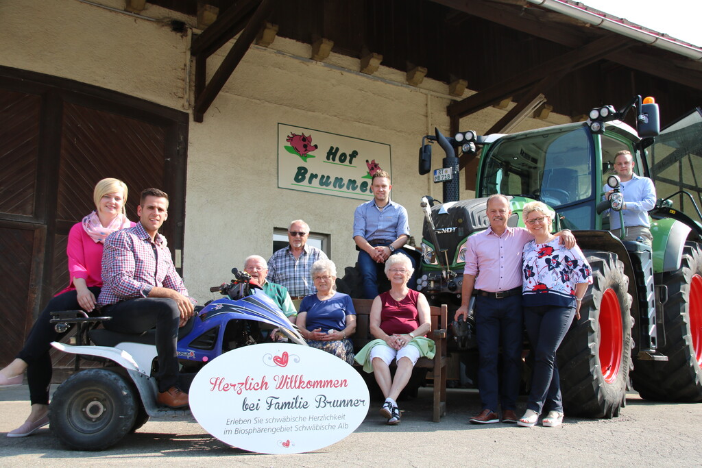 Familie Brunner, die schwäbischen Musketiere, überzeugt mit einem ganzheitlichen Betriebskonzept. Drei Generationen arbeiten Hand in Hand und tragen die „Schwäbische Herzlichkeit“ in die Welt. Der Ferienhof Brunner befindet sich in Hayingen-Münzdorf im Landkreis Reutlingen im Biosphärengebiet Schwäbische Alb.