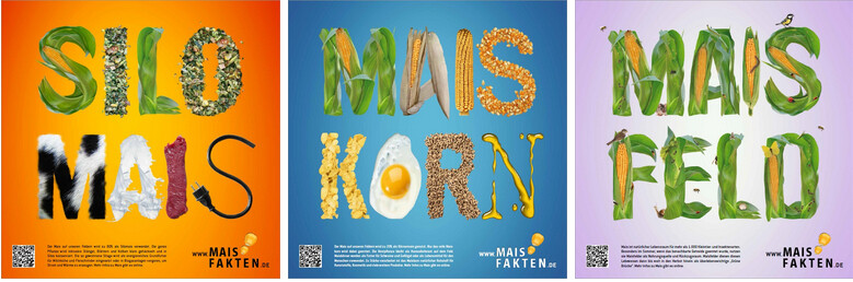 Jeder einzelne Buchstabe enthält eine Botschaft. So sind die Buchstaben im Wort Silomais etwa aus Maiskolben, Maisblättern, Maissilage, Kuhfell, Milch, Fleisch und einem Stromkabel gestaltet. Ein kurzer Text am unteren Rand erläutert dann, auf welch unterschiedliche Art und Weise der Mais, der als Silomais auf den Feldern wächst, nach der Ernte genutzt wird. Beim Feldschild Maiskorn stehen die vielfältigen Verwendungsmöglichkeiten des Körnermaises im Fokus. Beim Feldschild Maisfeld geht es um den Maisacker als natürlichen Lebensraum für über 1.000 Kleintier- und Insektenarten. Darüber hinaus verweisen die Schilder auf weitergehende Informationen unter www.maisfakten.de.