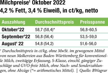 Der gewichtete BWagrar Milchpreis für konventionell erzeugte Kuhmilch ist im Oktober auf 58,7 Cent pro kg gestiegen. Das sind nochmals 1,9 Cent mehr als im September mit 56,8 Cent pro kg. Damit sind die Milchauszahlungspreise auf einem historisch hohen Niveau angelangt.