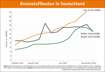 Unter den drei Energieträgern Erdgas, Heizöl und Holzpellets sind Pellets aktuell nicht mehr die günstigste Variante.
