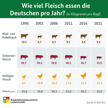 Nach vorläufigen Angaben des Bundesinformationszentrums Landwirtschaft (BZL) sank der Pro-Kopf-Verzehr von Fleisch im Vergleich zu 2020 um 2,1 Kilogramm und liegt damit auf einem neuen Rekordtief seit Berechnung des Verzehrs 1989.