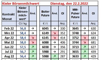Im Februar 2022 erhöhte sich der aus den Marktpreisen für Butter und Magermilchpulver ermittelte Kieler Rohstoffwert Milch des ife Instituts für Ernährungswirtschaft Kiel um 2,0 Cent oder 3,7 Prozent auf 56,3 Cent je kg Milch.