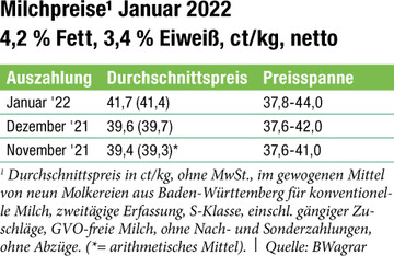 Im Januar 2022 hat sich der gewichtete monatliche BWagrar Durchschnittspreis für Milch von 39,6 Cent pro kg im Dezember auf 41,7 Euro pro kg deutlich um fast zwei Cent weiter erhöht. Im arithmetischen Mittel liegt der Preis im Januar bei 41,4 Cent pro kg gegenüber 39,7 Cent noch im Dezember.