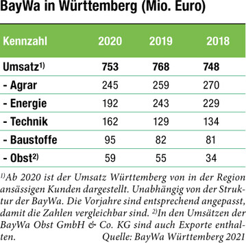 Die BayWa erwirtschaftete im vergangenen Geschäftsjahr in Württemberg einen geringeren Umsatz. Die Zahlen sanken 2020 auf 753 Mio. Euro nach 768 Mio. Euro im Jahr zuvor. Zuwächse gab es bei Technik, Baustoffen und Obst; Einbußen bei Agrar und Energie.