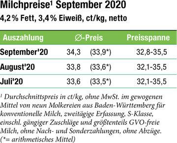 Der BWagrar-Milchpreis für konventionelle Milch hat sich im September gegenüber August um 0,5 Cent pro kg auf durchschnittlich 34,3 Cent pro kg erhöht. Der Biopreis blieb unverändert auf durchschnittlich 47,1 Cent pro kg. Damit hat sich das Preisniveau für konventionelle Milch nach dem...