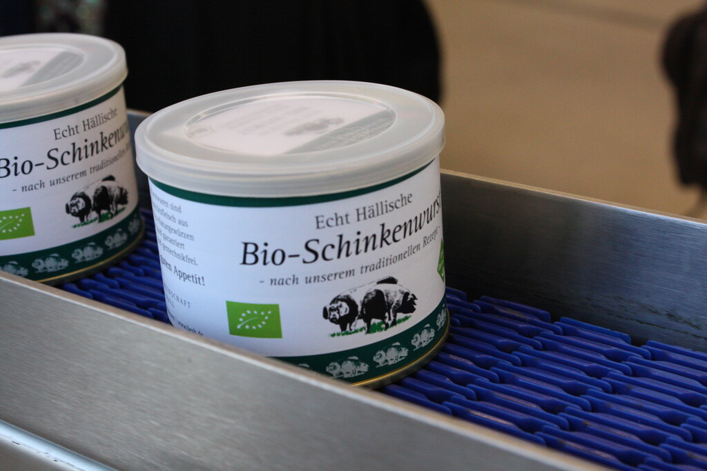 Bei der Wurstverarbeitung konzentriert sich die Erzeugergemeinschaft ganz auf die Dosenwurst, „der klassischen Büchsenwurst – ein Retroprodukt“, wie Bühler sagt. Wie bei der Hausschlachtung wird die Wurst ohne künstliche Zusätze hergestellt nach den traditionellen Rezepten von Metzgermeister Hans-Dieter Mayer, dem Patron der Manufaktur, „Bis zu 50.000 Dosen können am Tag produziert werden“, verweist der Vorsitzende stolz auf die Kapazität der neuen Anlage, die Ende Januar in Betrieb gegangen ist.