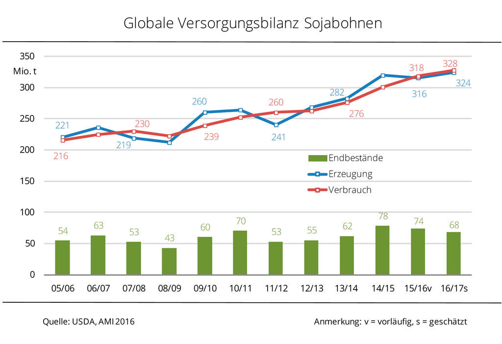 Laut dieser ersten offiziellen Prognose wäre dies dann immer noch der vierthöchste Bestand seit Aufzeichnungsbeginn. Grund für den Abbau ist der um rund 10 Mio. t auf das historisch höchste Niveau steigende Verbrauch von knapp 328 Mio. t. Zugleich steigt die Produktion um 8 Mio. t auf 324 Mio. t. Auch dies ist historisch gesehen die höchste Sojaernte. Nach Angaben der Agrarmarkt Informations-Gesellschaft (mbH) fußt dies vor allem auf einer gegenüber dem Vorjahr höheren Ernteerwartung für Brasilien und Indien. Treiber der steigenden Nachfrage sind, wie in den vergangenen Jahren, vor allem China und Indien.