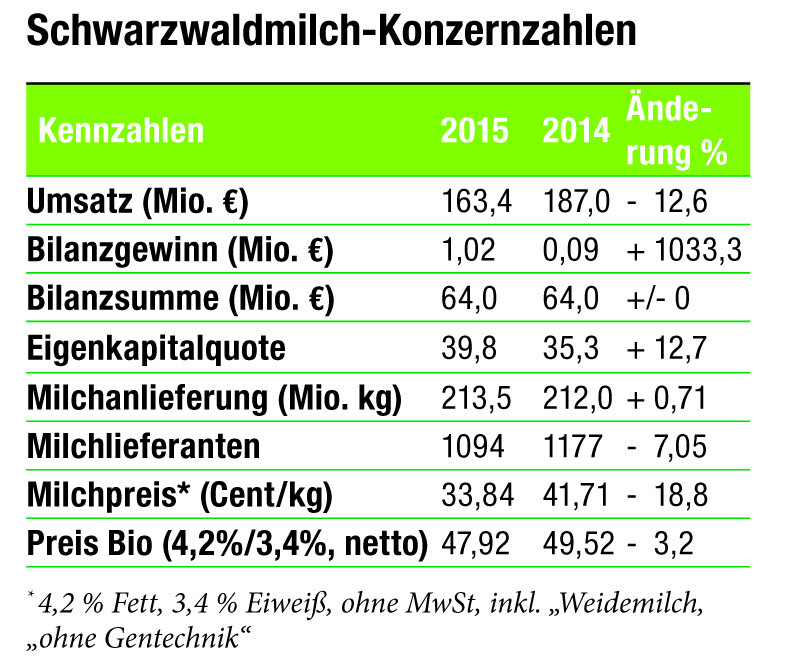 Zwar gebe es seit einigen Wochen bei zurückgehenden Anlieferungsmengen in der EU eine Marktstabilisierung, vor allem auf der Fettseite. Aber den Umsatz für das laufende Jahr stabil zu halten sei angesichts der verheerenden Abschlüsse für die Weiße Linie im April ein sehr ambitioniertes Ziel. Per Ende Juni lag der Umsatz auf Höhe des entsprechenden Vorjahreszeitraums, wobei im Bereich der Marken ein Plus von über 3,0 Prozent zu Buche steht. Im vergangenen Jahr sank der Umsatz der Schwarzwaldmilch-Gruppe um 12,6 Prozent auf 163,4 Mio. Euro. Das gedrückte Preisniveau und das Zurückfahren der Pulverproduktion sorgten für das Minus. Auch bei den Markenprodukten fehlten am Ende 2,9 Prozent Umsatz, bei Bioprodukten ergab sich ein Plus von 13 Prozent. Der Anteil der Markenprodukte bei der Produktion im Freiburger Werk stieg um acht Prozentpunkte auf 66 Prozent. In Offenburg sank der Umsatz insgesamt gesehen, bei milchbasiertem Spezialpulver und sogenannten anwendungsspezifischen Ingredients stieg er um 1,0 Prozent. Offenburg entwickle sich zu einem Standort weiter, an dem hochspezialisierte Produkte für die Ernährungsindustrie produziert werden.