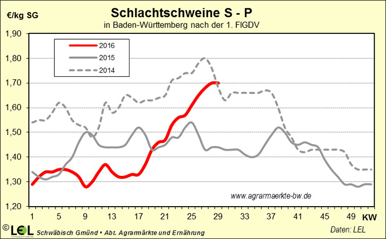 Die Exporte an deutschem Schweinefleisch nach China lagen von Januar bis Mai bei 234.682 t (+87,4 Prozent). Insgesamt lag die Exportmenge aus Deutschland bis Mai 2016 bei knapp 1,2 Mio. t (+2,1 Prozent gegenüber Vorjahr). Bedingt durch das rückläufige Angebot an schlachtreifen Schweinen, welches nur knapp bedarfsdeckend ausfiel, konnten europaweit seit Anfang Mai steigende Preise erzielt werden. Nach einer Phase ansteigender Preise über mehrere Wochen hat der Schweinemarkt nun eine Verschnaufpause eingelegt. Ferienbedingt wird die Nachfrage nach Schweine-fleisch in Deutschland schwächer, jedoch fällt das Angebot an lebenden Schlachtschweinen ebenfalls sehr überschaubar aus, so dass die Preise stabil blieben.