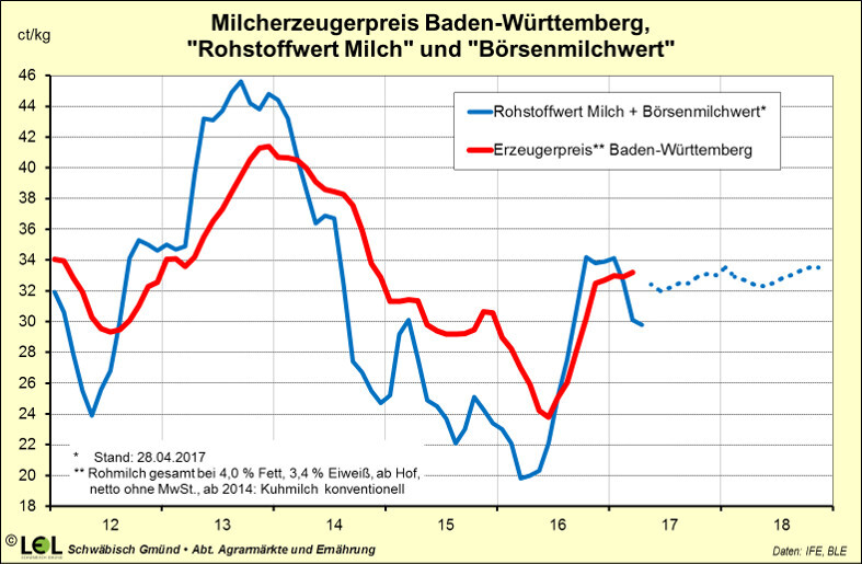 Die aktuellen Abschlüsse mit dem Lebensmittelhandel deuten in dieselbe Richtung. Bei Trinkmilch wurden in den bisher bekannt gewordenen Abschlüssen 3 ct/l mehr vereinbart. Bei Butter steigen die Ladenpreise um 10 ct/250g-Päckchen, was in der Verwertung umgerechnet 4 ct/kg am Erzeugerpreis ausmacht.Auch am Terminmarkt ziehen die Notierungen wieder an. Umgerechnet auf Erzeugerpreise liegt der „Kieler Börsenmilchwert“ für 2017 mit 32 bis 33 ct/kg aktuell wieder rund 1 bis 2 ct/kg höher als noch vor zwei Wochen. Der Kieler „Rohstoffwert Milch“ war im April sogar unter 30 ct/kg abgerutscht.