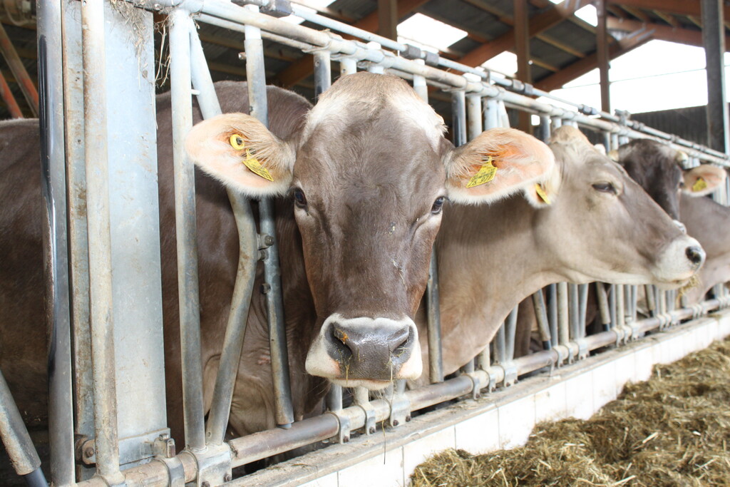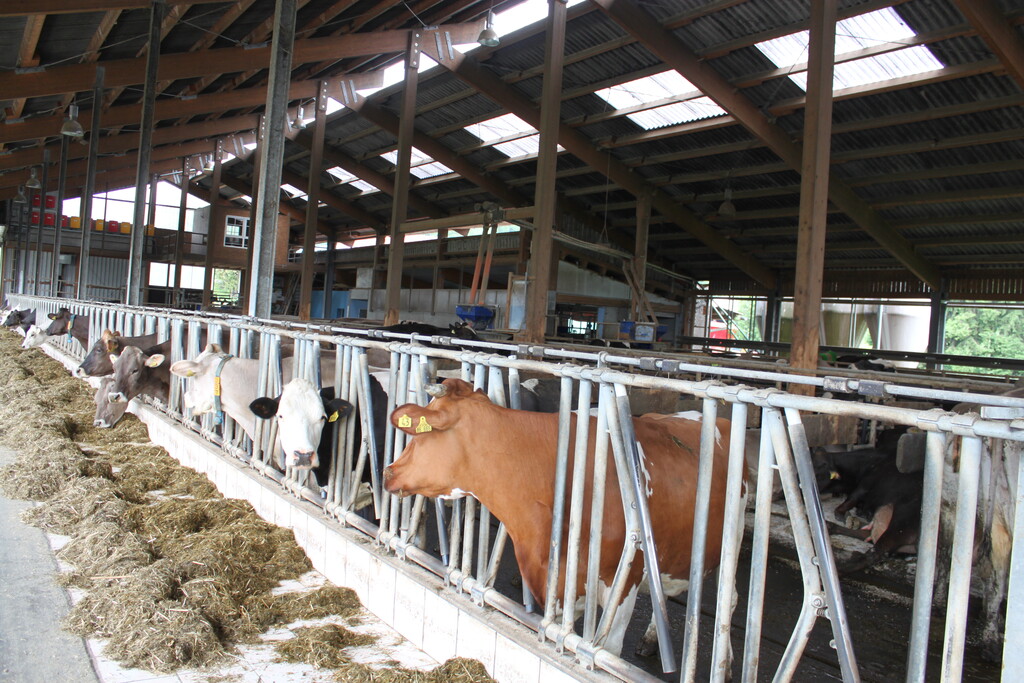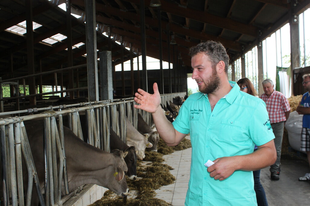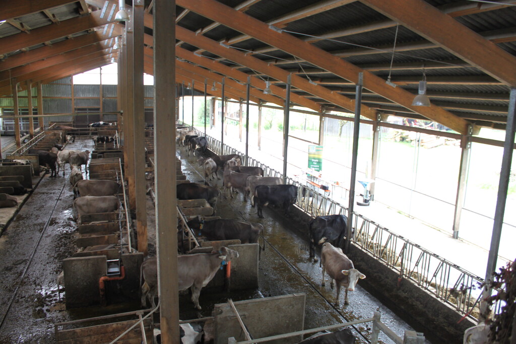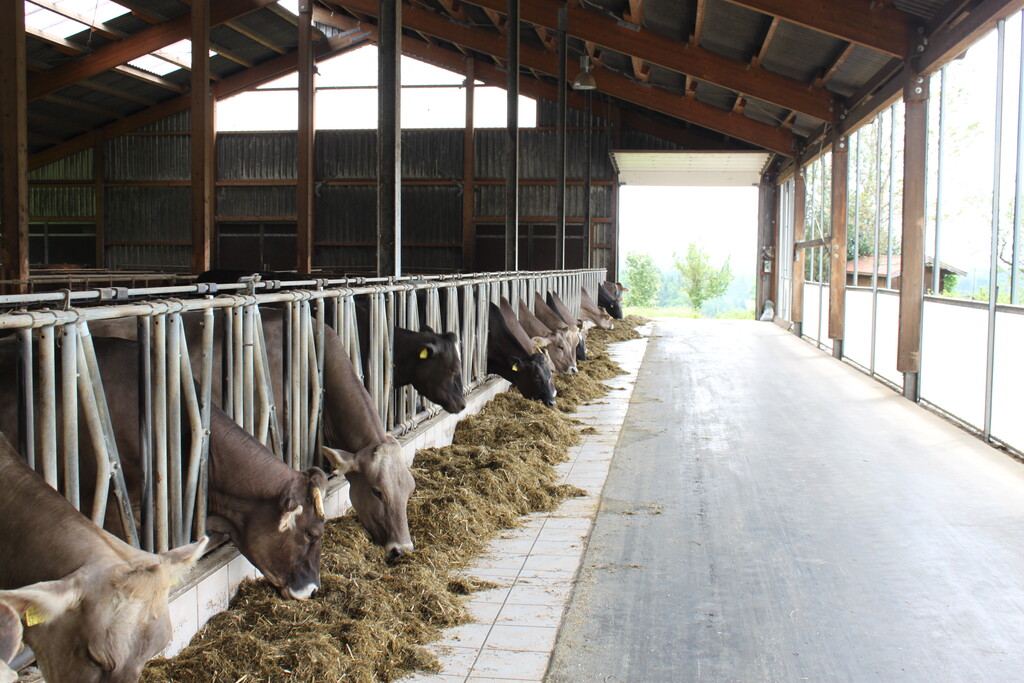 Kuhgeräusche sind im offenen und lichtdurchfluteten Laufstall von Familie Stauber an diesem späten Vormittag so gut wie keine zu hören. Die Tiere liegen, fressen gemächlich oder ziehen fast lautlos ihre Runden. Auf dem Dach ist eine Fotovoltaikanlage installiert. Zwischen Dach und Anlage gibt es ein Luftpolster. „Das ist eine tolle Isolierung, damit sich der Stall im Sommer nicht so stark aufheizt“, berichtete Christoph Stauber.