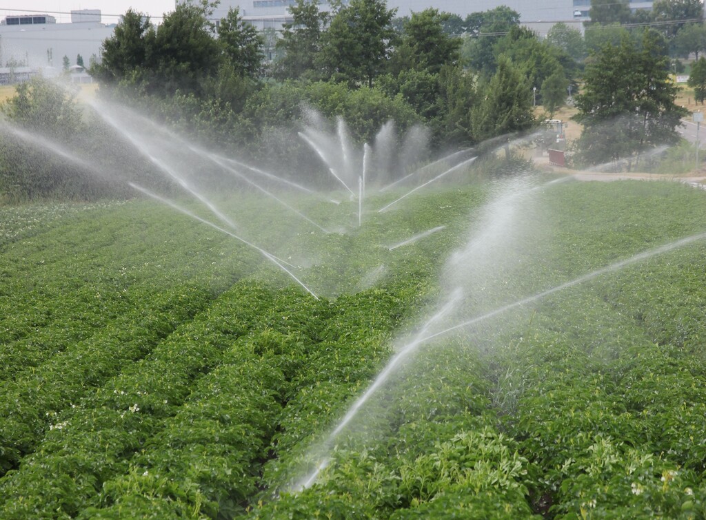 Der Gemüsebau kommt unter der sommerlichen Hitze nicht ohne zusätzliche Wasserzufuhr aus. Im Gemüsegarten Stuttgarts - auf den Fildern - wird in diesen Tagen deshalb regelmäßig beregnet. Im Bild zu sehen ein Kartoffelfeld bei Scharnhausen.