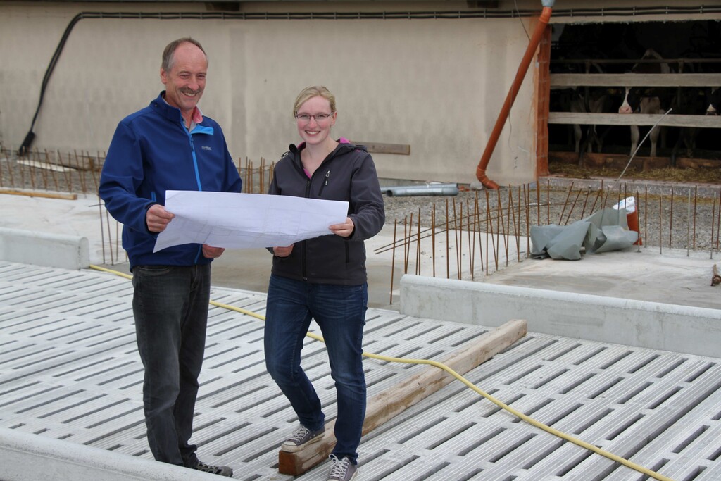 Für die Technikerin stand schnell fest, dass der Milchviehstall in Zukunft auch als Ein-Frau-Betrieb geführt werden können muss. Dafür muss die Arbeitsbelastung reduziert werden. Steht die Junior-Bäuerin heute noch zweimal täglich in der Melkergrube um die 65 Kühe zu melken, so soll ab Herbst die Aufgabe von einem Melkroboter erledigt werden.
