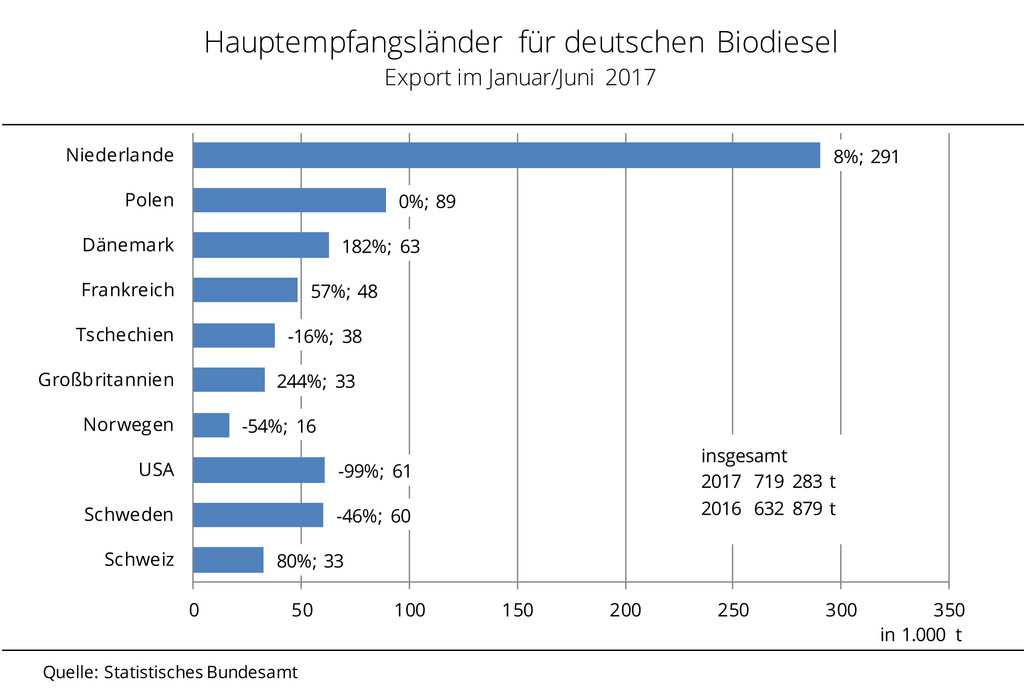 Im ersten Halbjahr 2017 stiegen die Biodieselausfuhren gegenüber dem Vergleichszeitraum 2016 um 13,7 % auf 720.000 t. Dabei gingen über 93 % der Ausfuhren in die Länder der EU-28. Wichtigster Abnehmer für deutschen Biodiesel bleiben die Niederlande mit einem Zuwachs von 8 % auf 291.000 t. Polen ist mit einer konstanten Menge von 89.000 t weiterhin zweitgrößter Nachfrager.