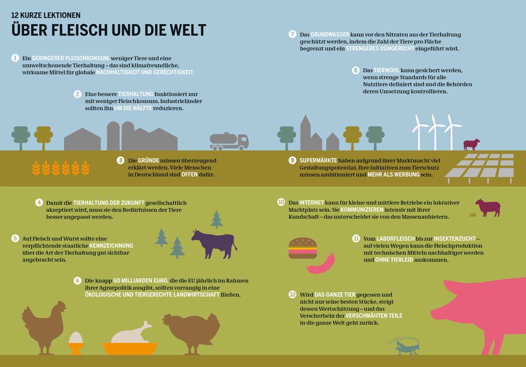 Ein ökologischer Wandel in der Tierhaltung sei nur mit neuen politischen Strategien und einem geschärften Bewusstsein bei Verbrauchern möglich, so die Organisationen. Der BUND und die Heinrich-Böll-Stiftung werfen der Bundesregierung Handlungsunwilligkeit vor und fordern den dringend notwendigen Umbau der Nutztierhaltung endlich zu beginnen. Dazu gehöre auch, eine verpflichtende Kennzeichnung bei Fleisch einzuführen – vergleichbar der Eier-Kennzeichnung, die dazu geführt habe, dass Eier aus Käfighaltung ausgelistet wurden.