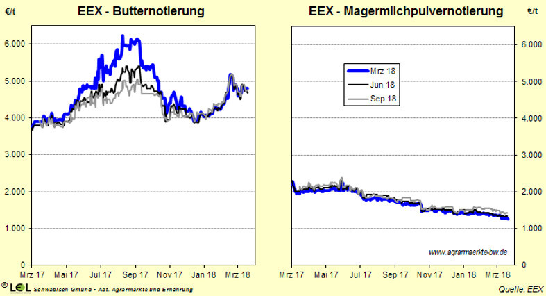 Die hohen Bestände an Magermilchpulver lassen die MMP-Kurse dagegen immer weiter absinken. Bisheriger Tiefpunkt war zuletzt der Verkauf von 4.000 t MMP aus der Intervention zu 1,10 Euro/kg. Die jüngste Erholung der Butter-und Fettpreise stützt die Verwertung und mildert der Rückgang der Milchpreise ab. Davon profitieren können in bisher begrenztem Umfang auch die Käsepreise. Günstig für die weiteren Aussichten in 2018 sind das stärkere Wachstum der Weltwirtschaft, die wieder wachsende Import-nachfrage aus China, höhere Ölpreise, ein rückläufiges Milchaufkommen aus Neuseeland und niedrigere Milchproduktenpreise, die die Nachfrage beleben.