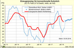 Deshalb sind die jetzigen Abschlüsse kaum nachvollziehbar. Scheinbar hat der in den letzten Wochen vor der saisonalen Angebotsspitze wieder etwas zunehmende Mengendruck die Molkereien gezwungen, derartig niedrige Angebote zu akzep-tieren. Deutlich wird auf jeden Fall die überproportionale Macht des LEH, gerade in diesem Segment, wo die Molkereien kaum Alternativen haben. Mehr Milch in Butter zu leiten scheint bei den nach wie vor niedrigen Magermilchpreisen die schlechtere Alternative zu sein.