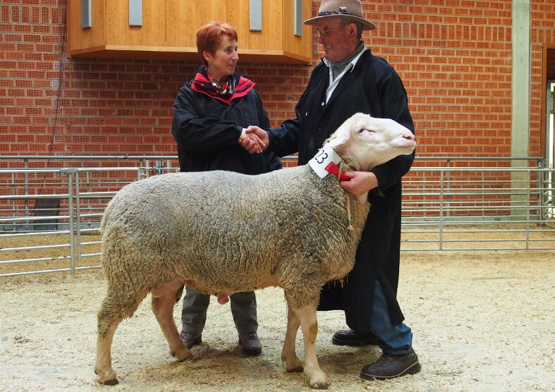 Zur Siegerehrung vor der Versteigerung war die Halle bereits gut gefüllt. Die Züchter der Gesamtsieger bekamen für ihre herausragenden Zuchterfolge jeweils einen Ehrenpreis des Ministeriums für Ländlichen Raum und Verbraucherschutz überreicht. Die Woll- und Fleischsieger wurden mit Prämien der Firma Grupp, Donzdorf und der Viehzentrale Südwest belohnt. Dann trat Versteigerer Berthold Majerus in bewährter Weise in Aktion. Die Nachfrage bei den Merinolandschafen war rege und die Gebote kamen meist zügig. Preisrichterin Andrea Burg hatte ihre Eindrücke vom Vortag noch in guter Erinnerung und ersteigerte den Gesamtsieger gleich selbst. Absoluter „Preishammer“ war ein Jungbock aus der Zucht Kleinbeck, Gültlingen, der für 5.500 Euro vom Zuchtbetrieb Füller in Bayern ersteigert wurde. Auch für die Suffolks lief es insgesamt gut. Hier machte sich vor allem die Nachfrage größerer Schafhalter bemerkbar, die sich mit Böcken zur Einkreuzung in ihre Merinolandschafherden versorgten. Das größte Lot bei den Fleischschafen stellte die Rasse Ile de France. Hier standen ganze Klassen von Jungböcken mit gleicher väterlicher Abstammung und dementsprechend einheitlicher Form und Fleischfülle zur Auswahl. Auch für die in geringerer Zahl vertretenen Rassen Schwarzköpfiges Fleischschaf, Texel und Coburger Fuchsschaf fanden sich Käufer - nicht zuletzt auch durch den unermüdlichen Einsatz von Berthold Majerus, der es verstand, die Vorfreude auf den Valentinstag in Kauflaune zu verwandeln nach dem Motto „Wie wär’s mit einem Bock statt Blumen?“