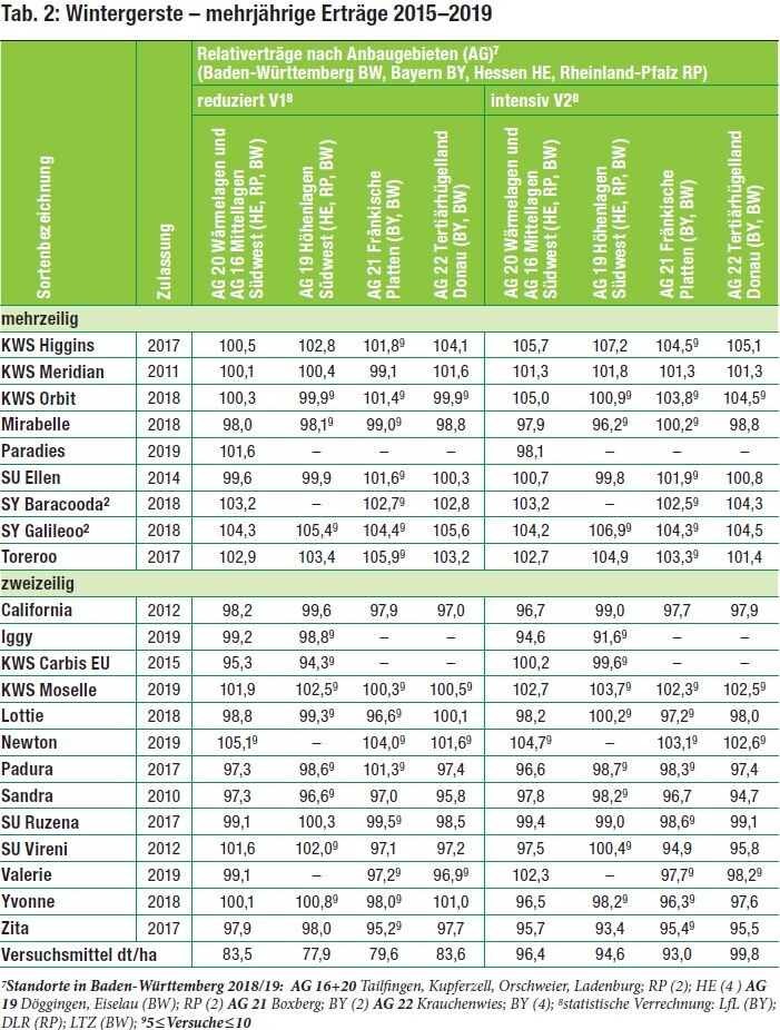 Toreroo: Hybride; 2019 und mehrjährig mit sehr hohen Ertragsleistungen in beiden Varianten; langwüchsig, leichte Lagerneigung (3,3); Halmstabilität (4,9) mittel; Ährenstabilität (3,4) gering; geringer Ramulariabefall (4,3) ansonsten gute bis mittlere Resistenzen; hoher Marktwareanteil; durchschnittliches hl-Gewicht.