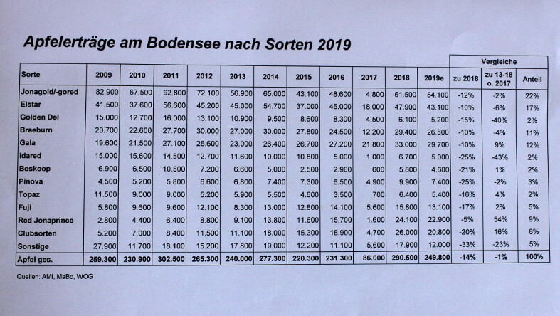 Für die deutsche Erzeugung werden mit 912.000 t die guten Ernten von 2014, 2016 und 2018 deutlich unterschritten. In Norddeutschland gab es Hagelschäden, die schwache Ernte wird mit 264.000 t um 16 Prozent unter dem Mittel der letzte fünf Jahre liegen. Auch Sachsen wird mit 83.000 t 19 Prozent unterm Schnitt ernten. In Süddeutschland bereitete das nasse Frühjahr Probleme mit Schorf.