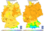 Bei den gegenwärtig hohen Temperaturen führt dies dazu, dass kein verfügbares Bodenwasser von den Pflanzen mobilisiert werden kann. Aktuelle Auswertungen zum Bodenfeuchtegehalt durch die Agrarmeteorologie des Deutschen Wetterdienstes (DWD) in Verbindung mit dem Erntezeitprognosemodell MaisProg zeigen, dass die nutzbare Feldkapazität (nFK) in dieser Woche auf 10 bis 20 Prozent (leichte, mittlere Böden) abnehmen wird. Nur südlich der Linie Stuttgart – Ingolstadt – Regensburg liegt die nFK (%) deutlich, im Nordwesten Schleswig-Holsteins und im Grenzgebiet zu Luxemburg etwas höher. Aus den Regionen, die bereits während der Hitzeperiode um den 25. Juli eine nFK von 10 bis 20 Prozent (Karte links) aufwiesen, wird über kolbenarme bzw. kolbenlose Bestände berichtet.