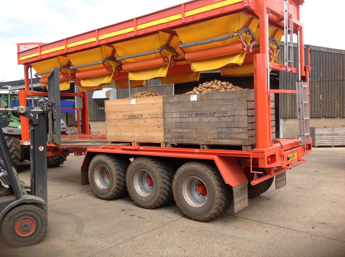 Der Guardian Box Loader wird wie ein herkömmlicher Bulk-Anhänger beladen, wodurch das Absenken eines Aufzugs in eine Kiste oder einen Anhänger während der Fahrt überflüssig wird. Ein weiches Schaumkissen, das mit strapazierfähigem PVC überzogen ist, nimmt das Erntegut auf und verlangsamt seinen Abstieg, bevor es sanft über eine patentierte Rutsche gleitet. Sobald der Anhänger voll beladen ist, wird er zum Lager zurückgebracht. Dort wird das obere Deck angehoben, sodass die befüllten Kisten direkt in das Lager befördert werden können. www.larringtontrailers.com