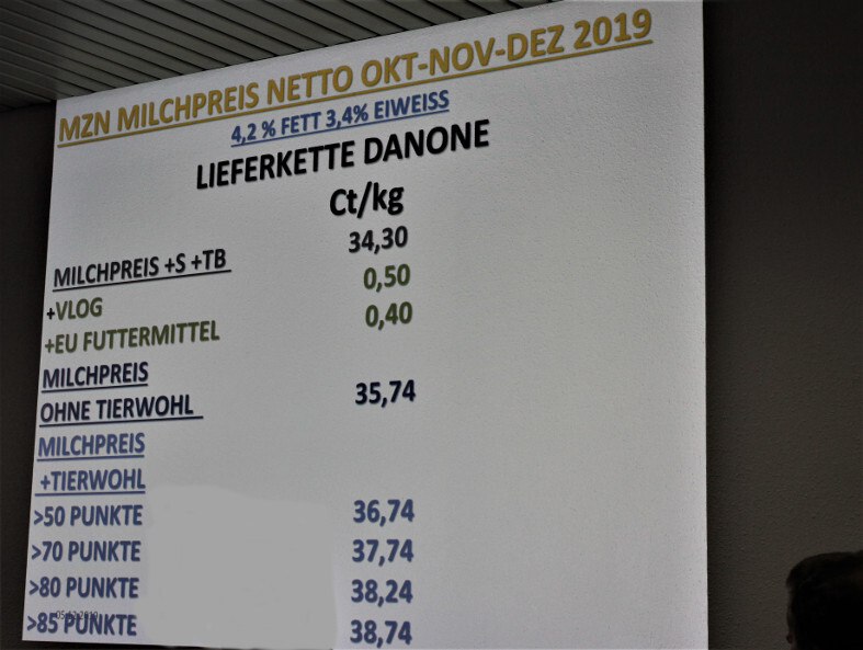 Bernhard Roth, der MZN-Aufsichtsratsvorsitzende, fasste das Jahr 2018 so zusammen: „Die Verhandlungen mit Danone waren hart. Aber unser Geschäftsführer hat rechtzeitig die Reißleine gezogen und bereits 2017 erste Gespräche aufgenommen, um den bis Ende 2020 laufenden Vertrag nach zu verhandeln.“ Ab Oktober 2019 war es soweit: „Wir bekamen die ersten Bonus-Zahlungen von Danone“, berichtete MZN-Geschäftsführer Dr. Francesco Albanese erleichtert. Im Gegenzug bekamen die noch 130 Erzeuger, die an Danone liefern, ein Tierwohl- und Nachhaltigkeits-Programm auferlegt, welches Vera Krüger vom Milcheinkauf bei Danone bereits auf der Versammlung 2018 angekündigt hatte. So ist ein Auditierungs-Progamm angelaufen, über das die Betriebe Punkte fürs Tierwohl und die Nachhaltigkeit sammeln können (Bonussystem).