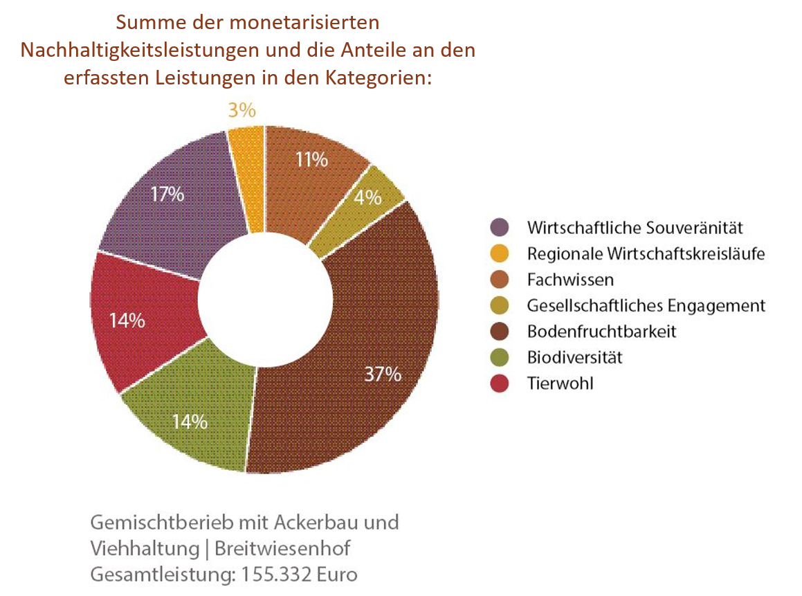 Im südlichen Schwarzwald wirtschaftet der Breitwiesenhof, ein Demeter-Gemischtbetrieb, seit Jahrzehnten ganzheitlich und praktiziert entgegen aller Spezialisierungstendenzen den vielfältigen landwirtschaftlichen Organismus. Würden seine sozial-ökologischen Leistungen in Höhe von 155.332 Euro vergütet werden, entsprächen sie knapp 18?Prozent seines Jahresumsatzes und gut 40 Prozent seines Umsatzes aus eigener Produktion. Er erwirtschaftet damit einen ähnlich hohen Geldwert wie der Obstbaubetrieb bei nur einem Drittel des Umsatzes.