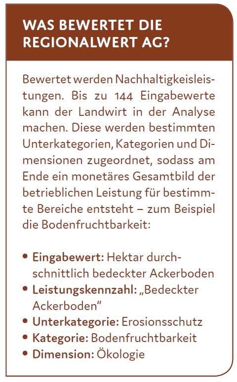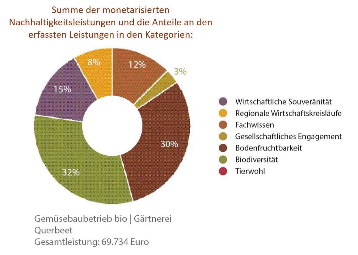 Insgesamt ergaben sich weit über 100 Leistungskennzahlen, die für einen Betrieb relevant sein können. Sie lassen sich den Kategorien Fachwissen, gesellschaftliches Engagement, Bodenfruchtbarkeit, Biodiversität, Tierwohl, wirtschaftliche Souveränität sowie regionale Wirtschaftskreisläufe zuordnen und bilden beispielsweise die soziale, regionalökonomische oder ökologische Dimension der Nachhaltigkeit ab.