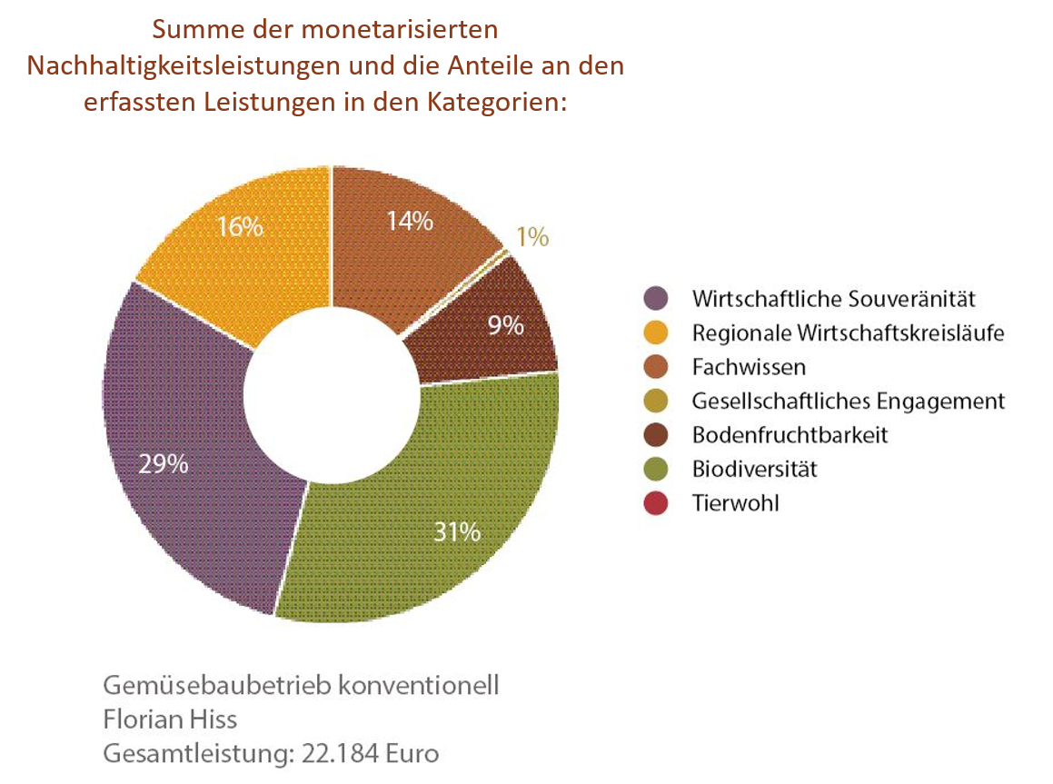 Die konventionelle Gemüsegärtnerei von Florian Hiss schuf bei einem Gesamtumsatz von etwa 600.000 Euro Mehrwerte von 22.184 ?Euro. Davon gingen 29?Prozent (6.433 Euro) auf die wirtschaftliche Souveränität zurück. Hier erreichte der Betrieb einen hohen Wert, da er hauptsächlich mit festangestellten Fachkräften arbeitet und nur wenig auf Saisonarbeitskräfte angewiesen ist. Viele Kunden mit relativ gleichmäßig verteilten Umsätzen sorgen außerdem dafür, dass die Gärtnerei von keinem übermäßig abhängig ist. Würde der umsatzstärkste Kunde jedoch für mehr als 30% des Umsatzes sorgen, würde das die wirtschaftliche Souveränität des Betriebs verringern.