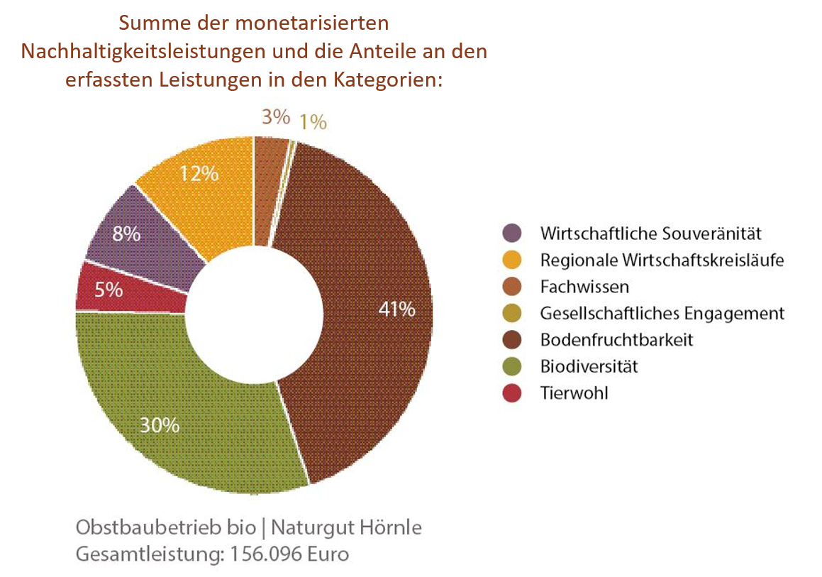Einen noch größeren Mehrwert erwirtschaftete der biologisch-dynamisch arbeitende Obstbetrieb Naturgut Hörnle (ehemals Obstgut Siegel) mit zusätzlichem Gemüseanbau und Legehennenhaltung. Er schuf einen Mehrwert von rund 156.000 Euro, was etwa 8,5 Prozent seines Gesamtumsatzes entspricht. Damit liegt der absolute Wert zwar höher als beim Demeter-Gemüsebaubetrieb, aber im Verhältnis zum Gesamtumsatz niedriger. Der Betrieb generierte vor allem in den Kategorien Bodenfruchtbarkeit und Biodiversität Mehrwerte, da er viel mit Gründüngung und Komposten arbeitet. So muss er weniger Dünger zukaufen.