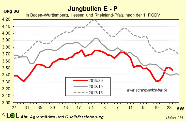 Die Rindfleischpreise tendieren derzeit insgesamt fester, wobei weibliche Tiere mehr gefragt sind als Jungbullen. Zwar wird auch hier vom Norden und aus Bayern von steigenden Forderungen in Folge geringer Stückzahlen berichtet, im Südwesten zeigen die Schlachtunternehmen allerdings nur wenig Bereitschaft höhere Preisforderungen zu erfüllen. In der Kalenderwoche 24 wurde von den preismeldepflichtigen Schlachtbetrieben im Südwesten für 2.250 Jungbullen im Schnitt der Handelsklassen S-P 3,47 Euro/kg SG bezahlt.