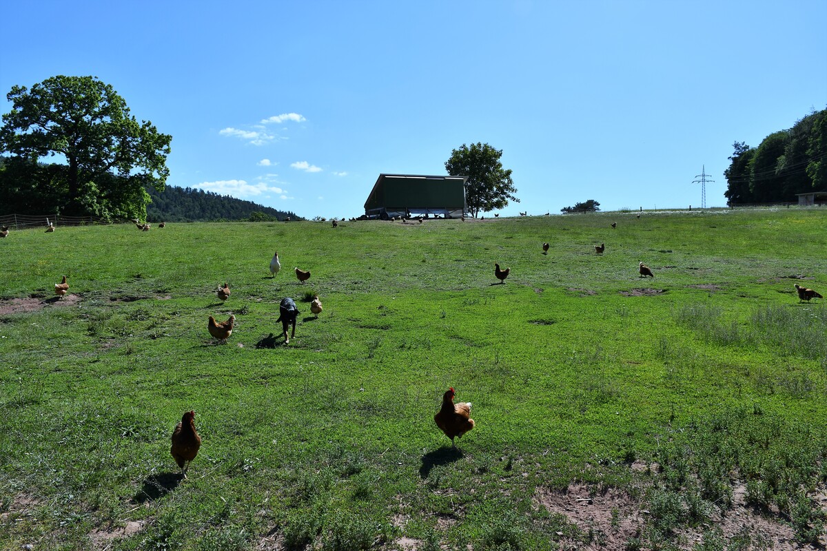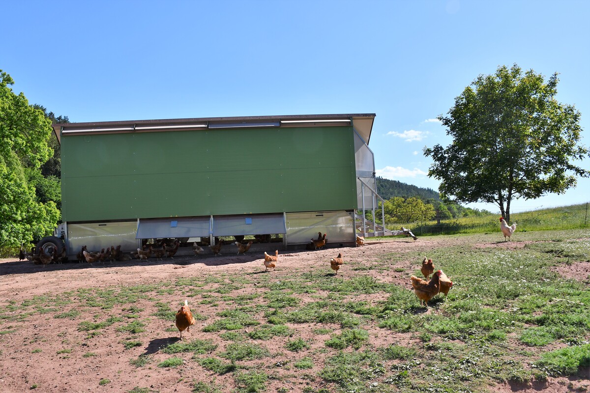 Von den ursprünglich 30 Kühen konnte das Paar nicht leben. Heute sind es 50 Mutterkühe plus Nachzucht, die auf den hofnahen Wiesen und auf der zugekauften Hofstelle weiden. Mit dem ersten mobilen Hühnerstall konnten sie die Eiernachfrage von 36 auf 1.000 Stück pro Woche steigern. Heute sind es drei mobile Hühnerställe mit rund 650 Legehennen und 3.500 Eiern pro Woche. Aus dem ehemaligen Rinderstall machten die beiden einen Schweinestall. Mittlerweile schlachten sie 100 Schweine und 60 Rinder im Jahr. Von einem Bio-Kollegen werden jährlich 60 bis 70 Lämmer zugekauft und vermarktet und weitere zehn bis 15 Altschafe, die zu Salami und Schinken verarbeitet werden. Zudem gibt es Pferde, Ponys und drei Hütehunde, die für Ordnung unter den Tieren sorgen.