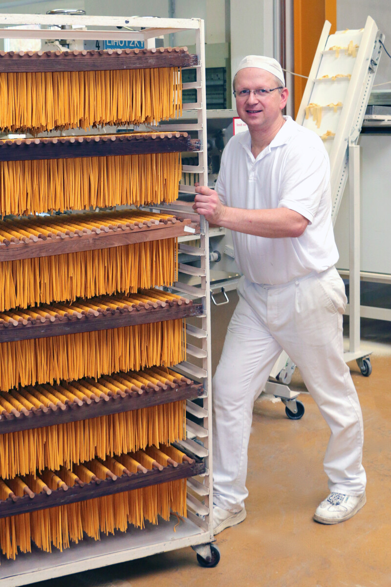 Verarbeitet werden neben Eiern, Kräutern und Gemüse auch Mahlerzeugnisse aus Hartweizen, Weizen und Dinkel – bevorzugt als Grieß, aber auch als Mehl. Beimischungen anderer Mehle wie Buchweizen- und Kastanienmehl sind möglich. Mindestanforderungen bezüglich Fallzahl, Eiweiß- und Feuchtklebergehalt sollte das Getreide erfüllen. Bis zu 50 % der Mehlmenge in der Rezeptur lässt sich durch Presskuchen von Sonnenblumen und Hanf oder ähnliche Produkte ersetzen. Eier müssen gekühlt und tagesfrisch aufgeschlagen oder pasteurisiert angeliefert werden. Falls nötig, besorgt Burks alle Rohstoffe in Bio- oder konventioneller Qualität.