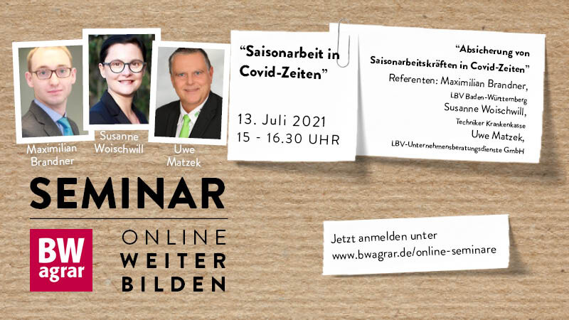 Im BWagrar Online-Seminar am Dienstag, 13. Juli 2021, von 15 bis 16.30 Uhr, sprechen Maximilian Brandner, Rechtsanwalt und Referent Sozialrecht beim Landesbauernverband in Baden-Württemberg (LBV), erklärt die Möglichkeiten einer kurzfristigen Beschäftigung insbesondere unter Ausnutzung der 102-Tage-Regelung vorstellen, welche eine zeitweise Ausweitung der Zeitgrenzen von drei auf vier Monate bzw. von 70 auf 102 Arbeitstage ermöglicht. Der sozialversicherungsrechtliche Status stellt dabei die Weichen für die sich anschließenden Themen. Susanne Woischwill, Saisonarbeits-Expertin bei der Techniker Krankenkasse, wird über das Kassenwahlrecht, elektronischen Gesundheitskarten und das vereinfachte Anmeldeverfahren für Saisonkräfte informieren und Uwe Matzek, LBV-Unternehmensberatungsdienste GmbH (LBV-U), informiert über die private Erntehelferversicherung, die private Unfallversicherung sowie die Absicherung der Saisonkräfte in Haftpflicht-Fragen.