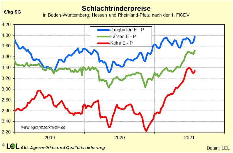 In KW 30 wurde von den meldepflichtigen Schlachtbetrieben im Südwesten für Jungbullen (E-P) im Schnitt 3,97 Euro/kg SG bezahlt. Bio-Jungbullen (E-P) erlösten im Juni im Bundesdurchschnitt 4,74 Euro/kg SG. Die Preise bei den weiblichen Schlachttieren profitierten nach den Gastronomieöffnungen im In- und Ausland von einer regen Nachfrage im Juni. Bei den Schlachtkühen ist der Preis in der KW 26 bis auf 3,40 kg/SG angestiegen. Nachdem die Schlachtkuhpreise im Juli wieder etwas nachgegeben haben, tendieren die Preise wegen des anhaltend knappen Angebots nun wieder fester. Von den meldepflichtigen Schlachtbetrieben im Marktgebiet wurde in KW 30 durchschnittlich 3,34 Euro/kg SG (E-P) bezahlt. Färsen erlösten im Schnitt 3,72 Euro/kg SG (E-P). In den kommenden Wochen dürfte das insgesamt weiterhin geringe Angebot an Schlachtrindern die Preise relativ stabil halten.