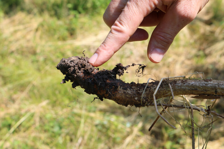 Auf der nicht gepflegten Fläche zwischen den Reihen müssen Sie die schnell wachsenden Sträucher konsequent mit dem Freischneider zurückdrängen, damit diese nicht zu groß werden und die Pflanzen überwachsen. Durch „Tupfen“ mit dem Häckselmesser lassen sich Büsche einfach beseitigen.