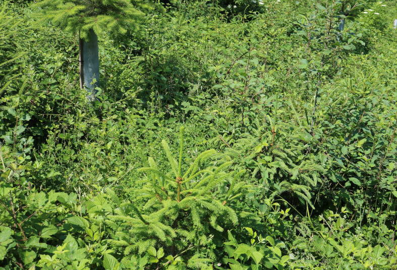 In der Röhre auch mal Ordnung schaffen: Wenn sich die Pflanzen in Tubexröhren befinden, werden diese wie jede andere Pflanze ausgemäht. Dann schaut man in die Röhre hinein, ob außer der Pflanze etwas in der Röhre wächst. Meist sind dies Brombeeren oder Sträucher. Diese sollten Sie entfernen, damit die Pflanze ungehindert wachsen kann. Dabei schieben Sie die Tubexröhre nach oben und schneiden die nicht gewollten Pflanzen mit einer Rebschere ab. Ziehen Sie diese dann heraus und schieben Sie die Tubexröhre wieder nach unten.