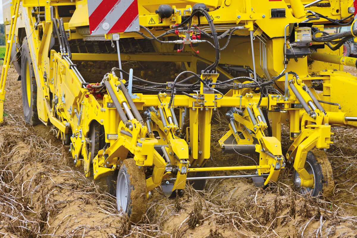 Eine Aufnahme ohne Dammrollen kann unter diesen speziellen Rodebedinungen Vorteile haben. Dammkronen und Dammflanken werden mit Gleitkufen abgetastet, so dass kein Gewicht auf den Dämmen lastet. Durch das seitliche Abtasten der Kartoffeldämme an der Außenseite ist eine Rodung in Kombination mit einem angereicherten Ernteverfahren ebenso möglich. Optionale hydraulisch angetriebene Scheibenseche sorgen für einen sauberen und störungsfreien Einzug der Kartoffeldämme. Die gewünschte Rodetiefe wird wie gewohnt am Terminal eingestellt. Ropas neue Aufnahme ohne Dammrollen regelt automatisch auf die eingestellte Rodetiefe, auch bei wechselnden Bedingungen.