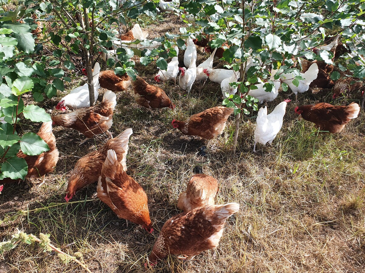 Inwischen ist die Agroforstfläche auf sieben Hektar angewachsen. Auf etwa 25 % der Fläche stehen Bäume, davon 70 % Pappeln. Jeder der sechs Mobilställe mit je 1000 Hühnern verfügt über drei Parzellen. Wenn eine Parzelle für zwei bis vier Monate leer steht, wird dieser Zeitraum genutzt, um das Gras nachzusäen und Pappeln nachzupflanzen (aktuell die Sorte 'Max3'). Ehe die Hühner wieder auf die Fläche gelassen werden, müssen die Pflanzen so hoch wachsen, dass die Vögel die Triebspitzen nicht mehr erreichen.