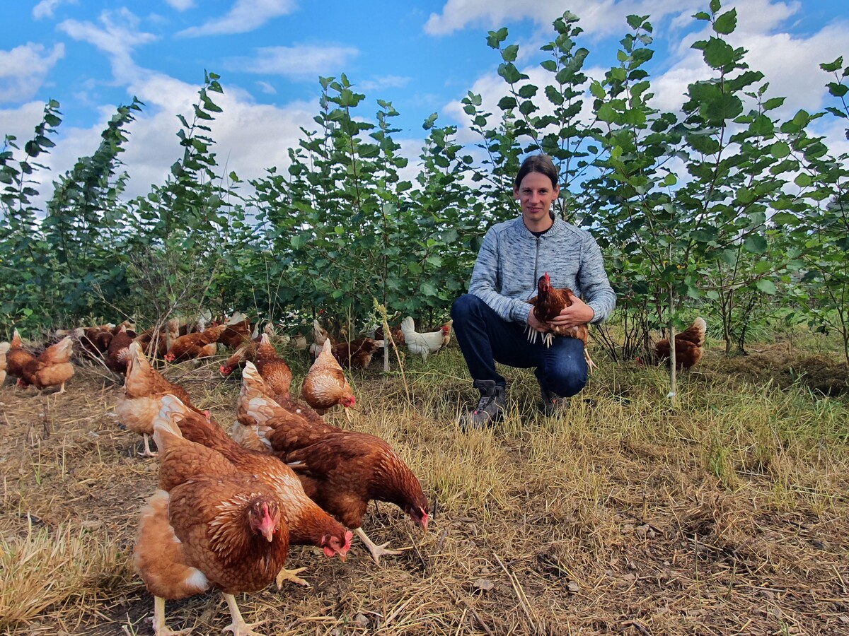 Eben erst hat Philipp Wörner den Mobilstall geöffnet und schon huschen die ersten Legehennen durch die Pappelreihen bis ans Ende der Parzelle. Von der üblichen Hühnertraube im Eingangsbereich ist nichts zu sehen. Susanne und Joachim Schneider, die Betriebsleiter des Hofguts Martinsberg bei Rottenburg am Neckar, kamen bereits 2009 auf die Idee, die Mobilställe mit der Energieholzproduktion zu kombinieren. 2013 erhielt der Biolandbetrieb dafür den Tierschutzpreis vom Land Baden-Württemberg. Philipp Wörner, der von 2019 bis Anfang 2023 den Betriebsbereich Legehennenhaltung leitete, kann sich die Hühnerhaltung gar nicht mehr anders vorstellen. „Die Vorteile der Kurzumtriebsplantage sind so groß, dass es gar keinen Sinn mehr macht, Hühner ohne Kurzumtriebsplantage im Freiland zu halten“, findet er.